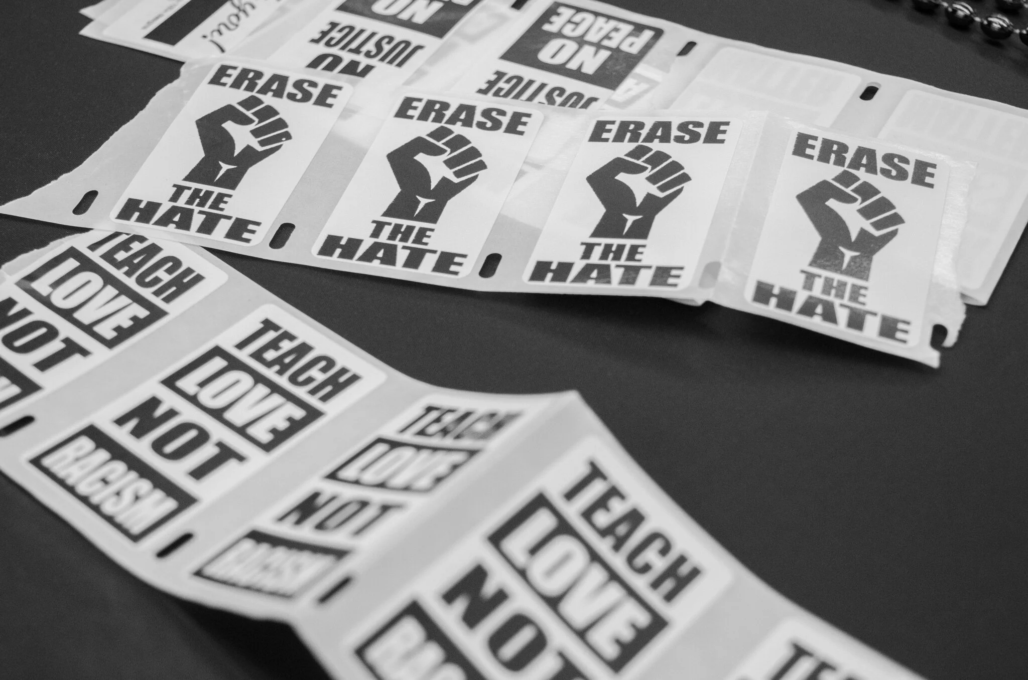 Black Live Matters awareness stickers placed around the tables in preparation for the BLM protest, on Oct. 24, 2020.