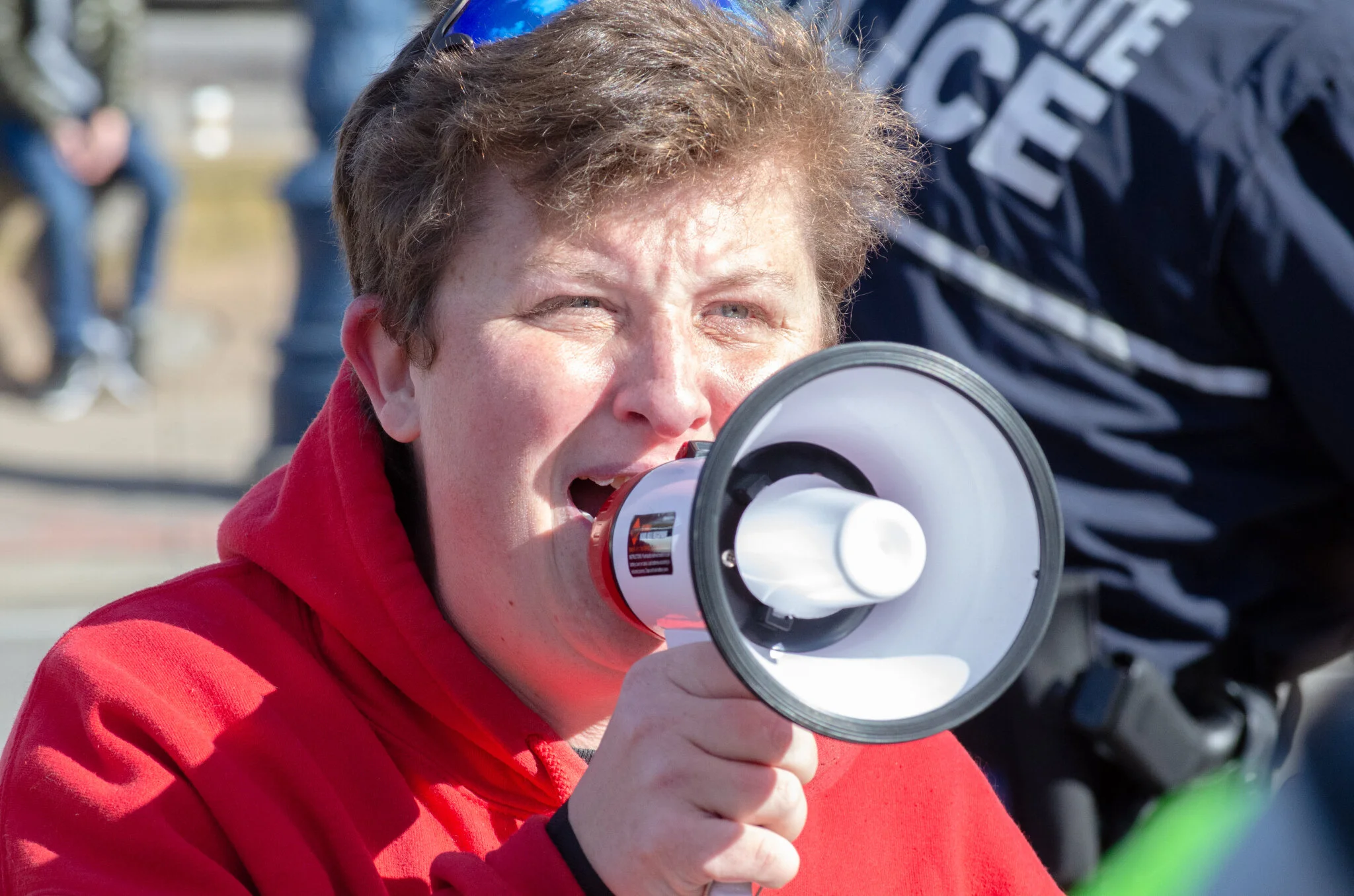 Jill Hundey speaks about being spat at and verbally attacked by “Proud Boys” and others during a previous Trump rally in Frankenmuth, MI, on Saturday Oct. 24, 2020.